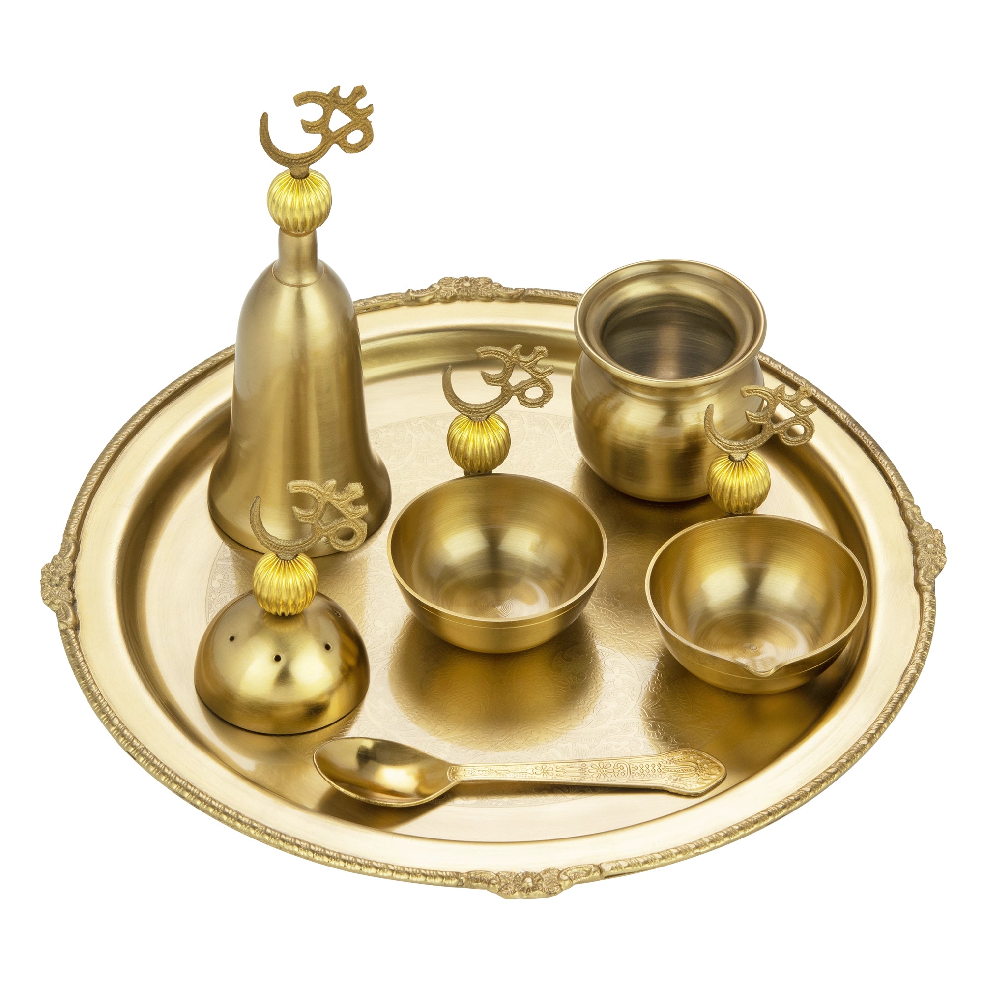 Collection of brass kitchenware including pots, bowls, and a goblet on a light background