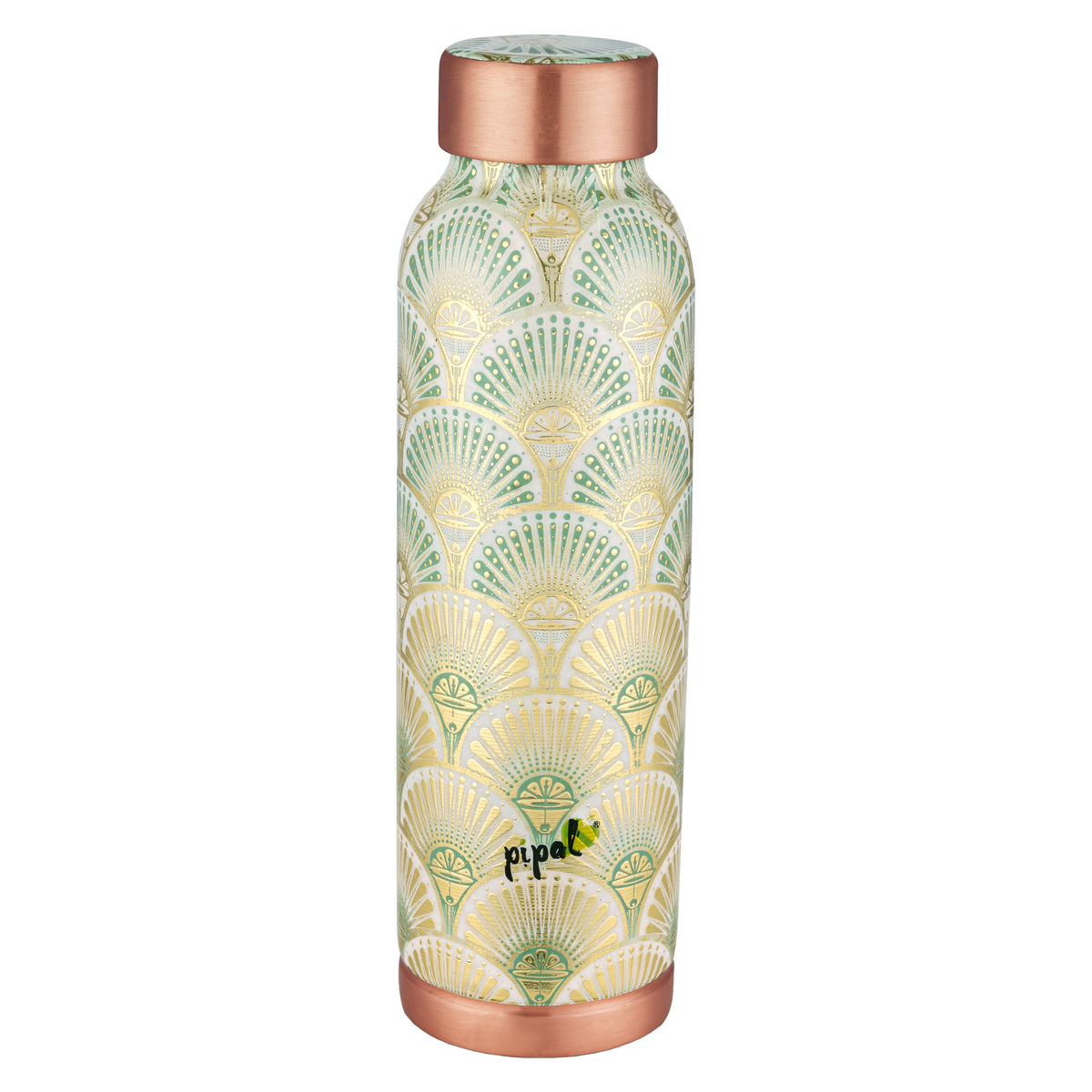The Pipal Caliber Mor Pankh Bottle is where Art Deco glamour meets pure wellness. This bottle showcases the robust, wide-mouth design of our Caliber line, wrapped in a breathtaking "Mor Pankh" (peacock feather) print. The pattern features elegant, repeating fans in a soft mint-green and white, with each one defined by gleaming, metallic gold stamping. It’s a design that evokes royalty and sophistication, turning your practical, everyday water bottle into a true showpiece.
