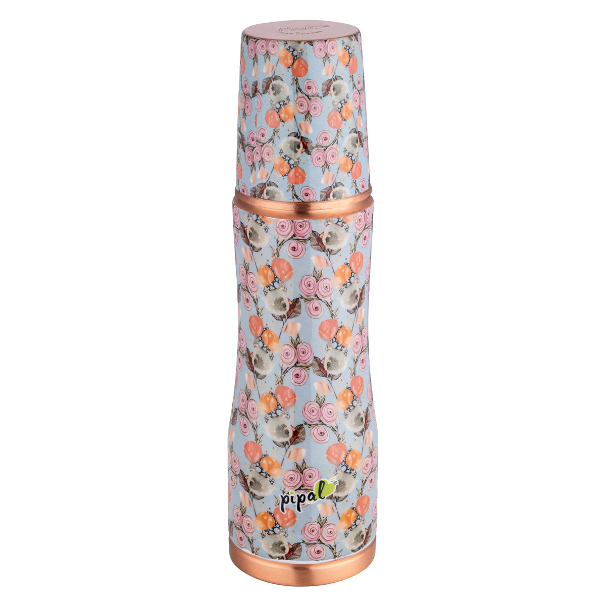 Bring a touch of cottage charm to your hydration with the Pipal Dew Wild Berries Bottle. This convenient 2-in-1 set features an 800ml copper bottle and a matching tumbler, both decorated with a lovely floral print. Set against a soft powder-blue, the "Wild Berries" design features romantic, watercolour-style roses and berries in warm pinks and peaches. The tumbler is smartly designed to invert and rest on the bottle's mouth, acting as a hygienic cover to keep your water fresh.