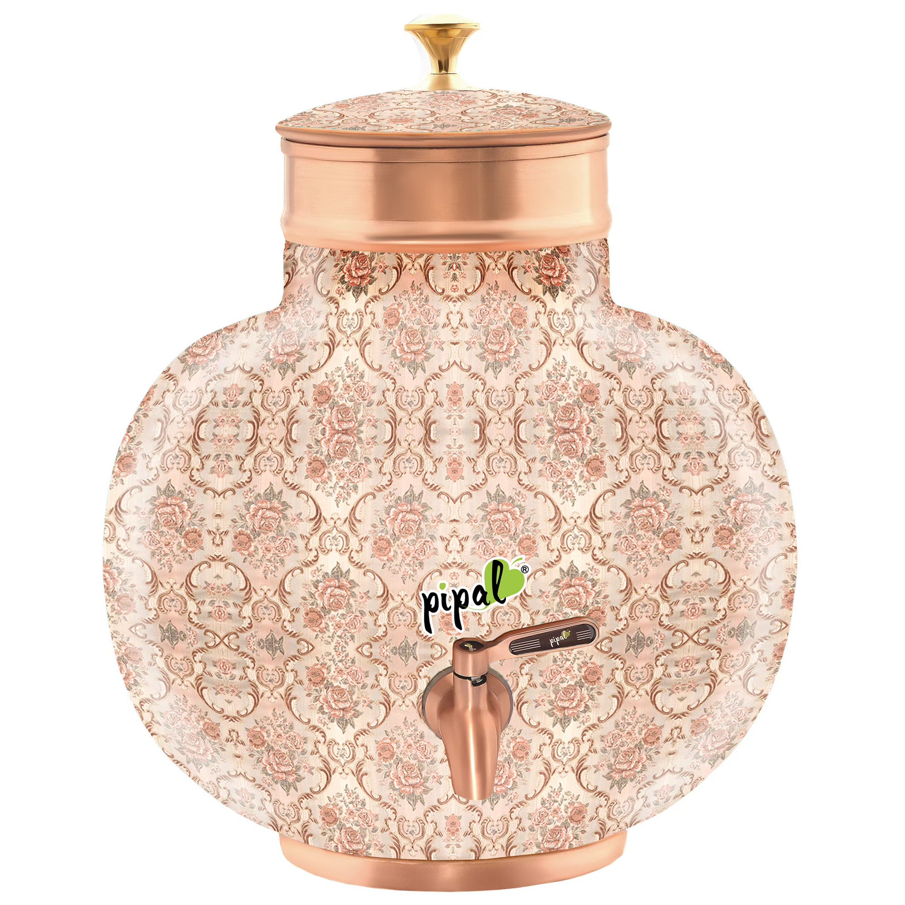 The Pipal Prithvi Printed Copper Matka brings a touch of elegance and tradition to your space with its beautiful, rounded shape and intricate designs inspired by Arabic aesthetics. This eye-catching matka is not only functional but also an exquisite piece for enhancing any home or office decor.