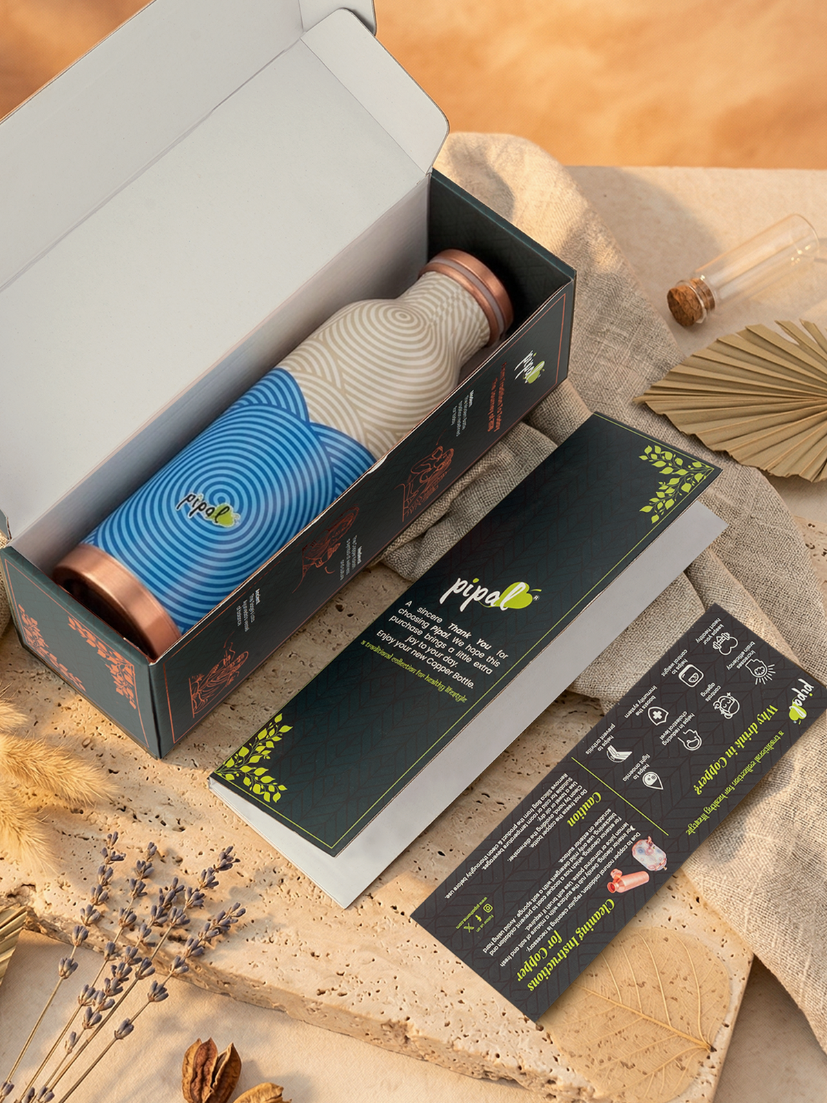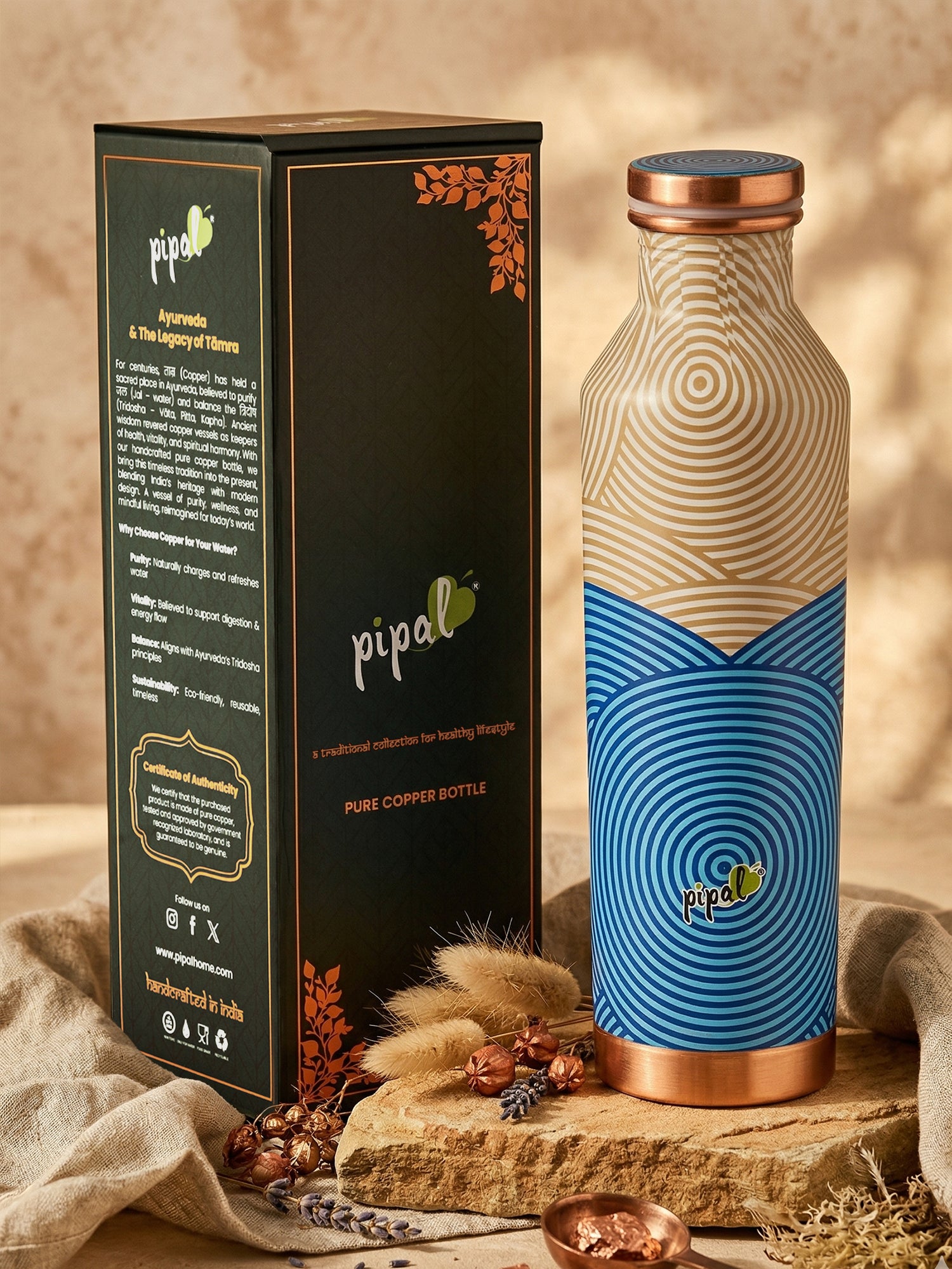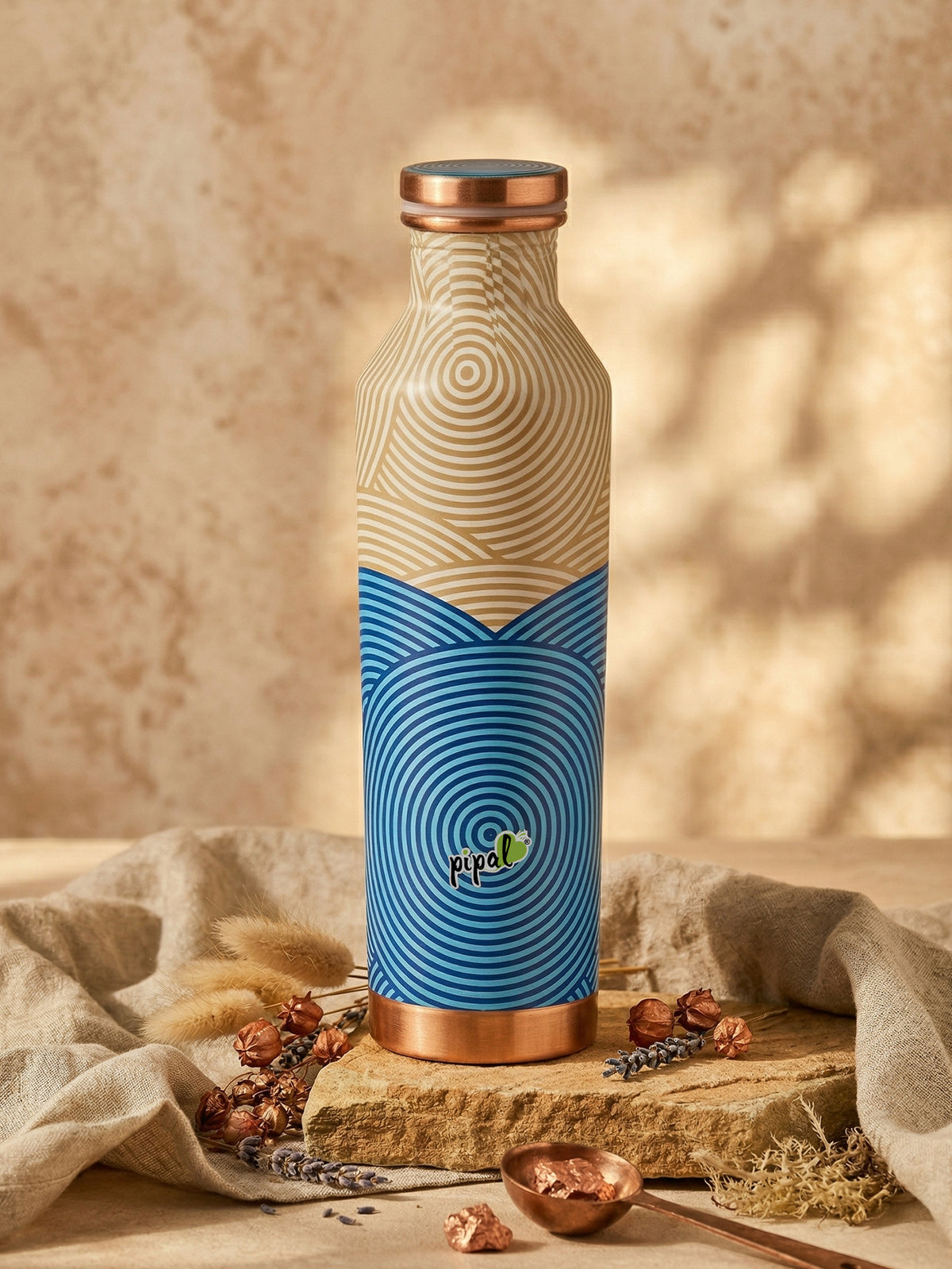 The Pipal Apex Ripple Copper Water Bottle draws inspiration from the calming movement of water itself. Its concentric ripple pattern creates a sense of flow and balance, blending contemporary design with functional drinkware.